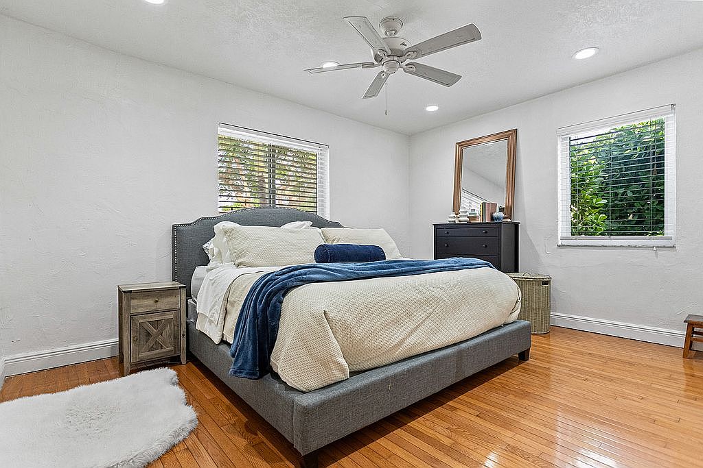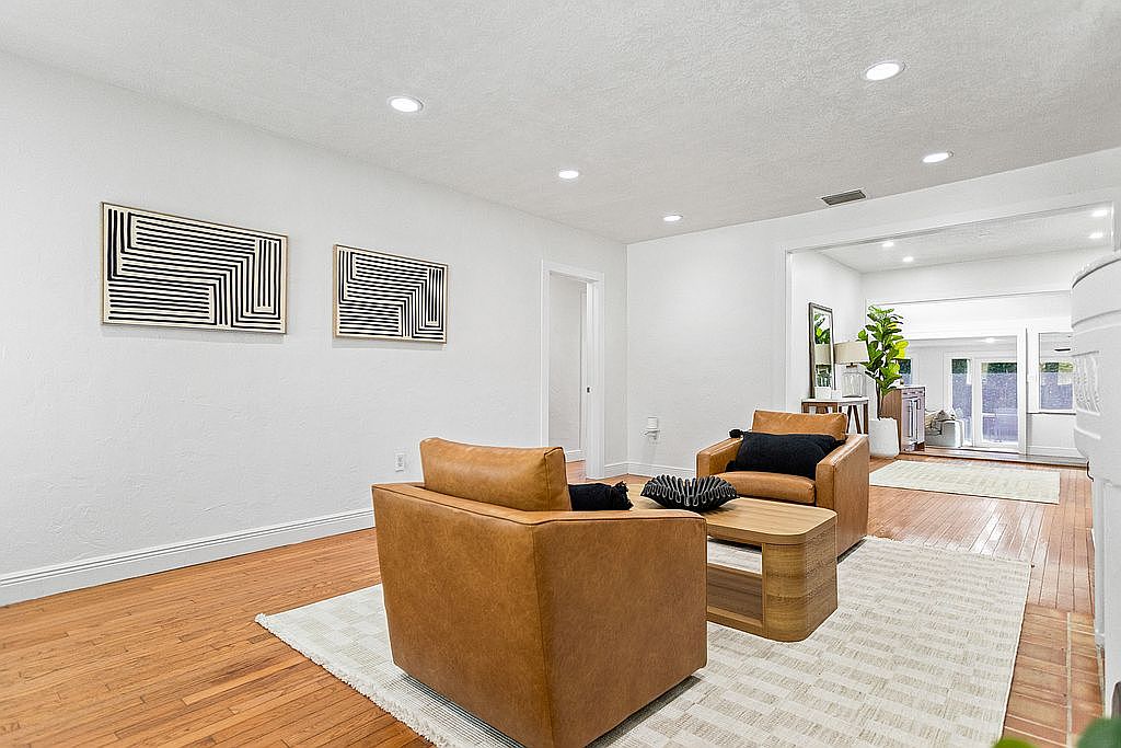 Boasting 4 bedrooms, 2 bathrooms, and a thoughtfully designed split floorplan flooded with natural light, this residence exudes a sense of modern elegance. Delight in a fully renovated kitchen, updated baths, impact windows, and versatile living spaces ideal for both relaxation and productivity. The elevated corner lot affords privacy and a charming outdoor oasis for al fresco gatherings or serene moments of reprieve.